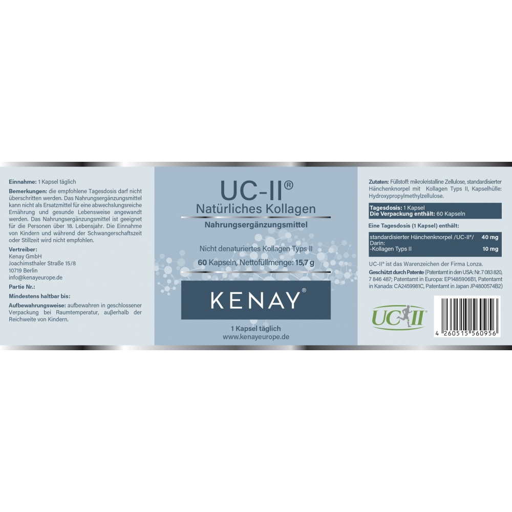 Ingredients: anticaking agent: microcrystalline cellulose, standardized chicken sternum cartilage incl. type II collagen, capsule shell: hydroxypropyl methylcellulose