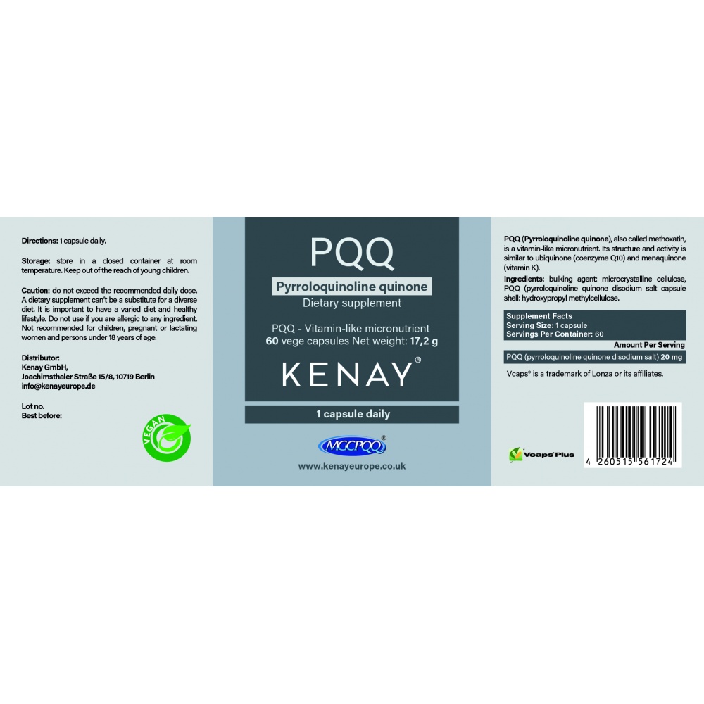 Ingredients: bulking agent: microcrystalline cellulose, PQQ (pyrroloquinoline quinone), capsule shell: hydroxypropyl methylcellulose