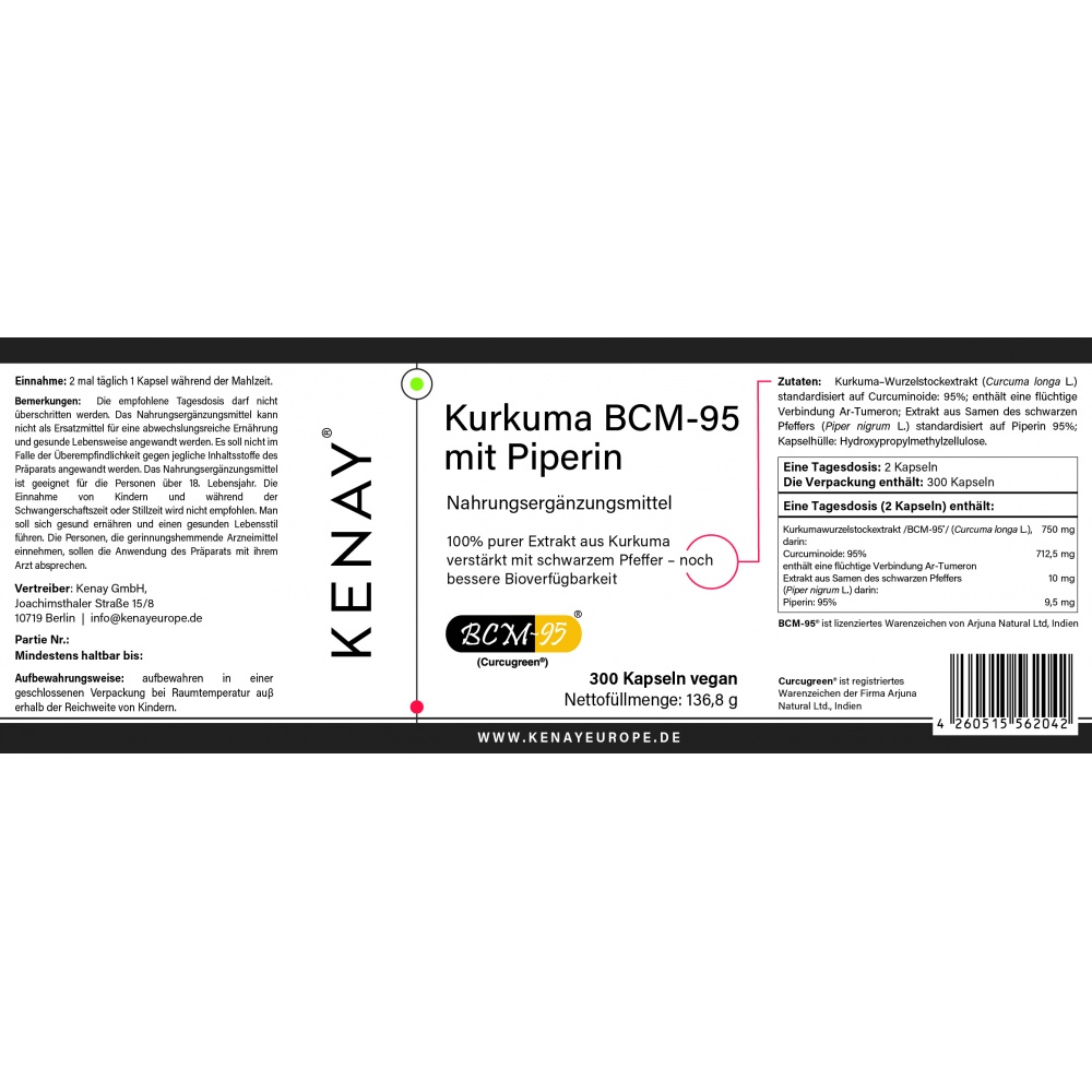 Ingredients: turmeric rhizome extract (Curcuma longa L.) standardized to 95% curcuminoids incl. ar-turmeroneas volatile oil; black pepper fruit extract (Piper nigrum L.) standardized to 95% piperine: capsule shell: hydroxypropyl methylcellulose
