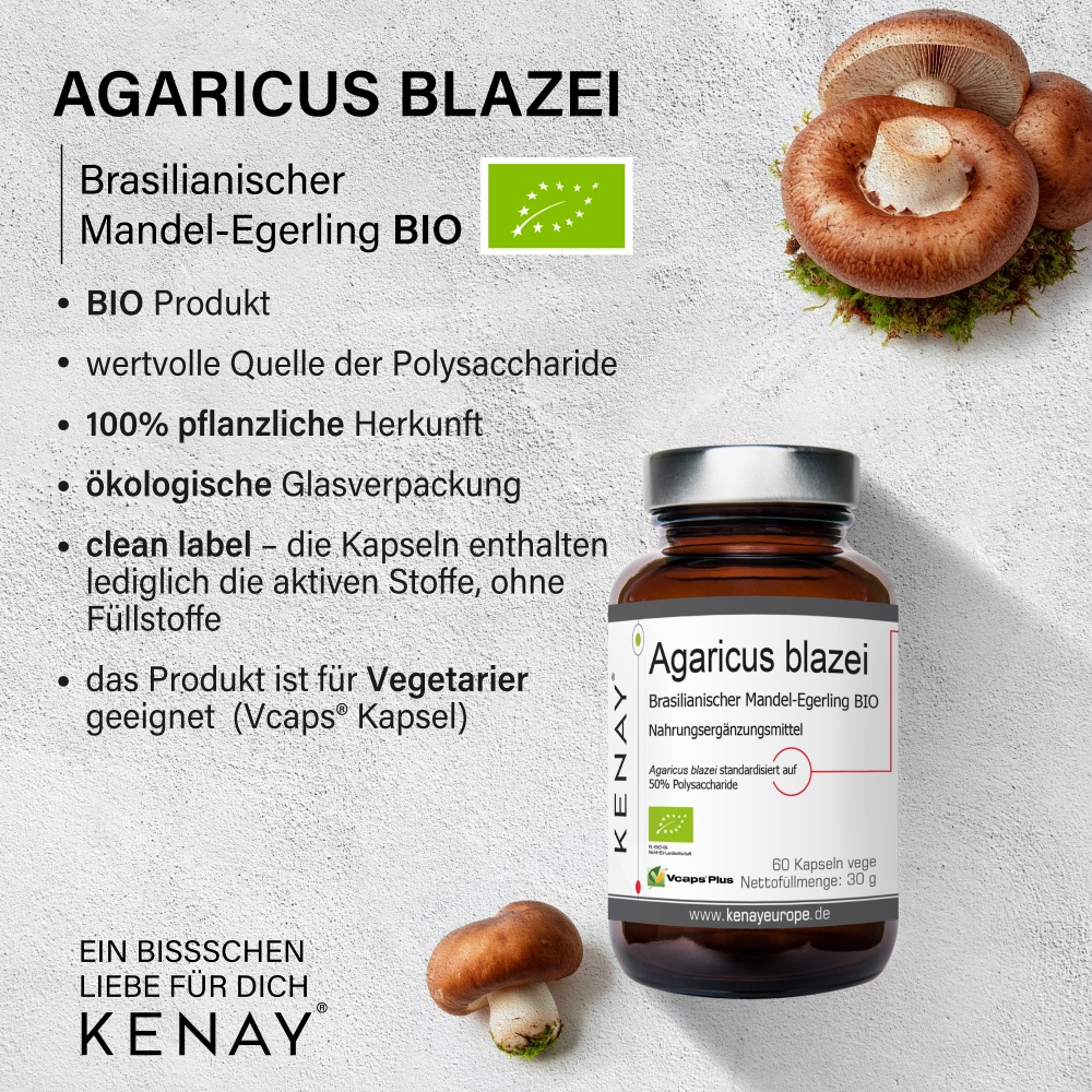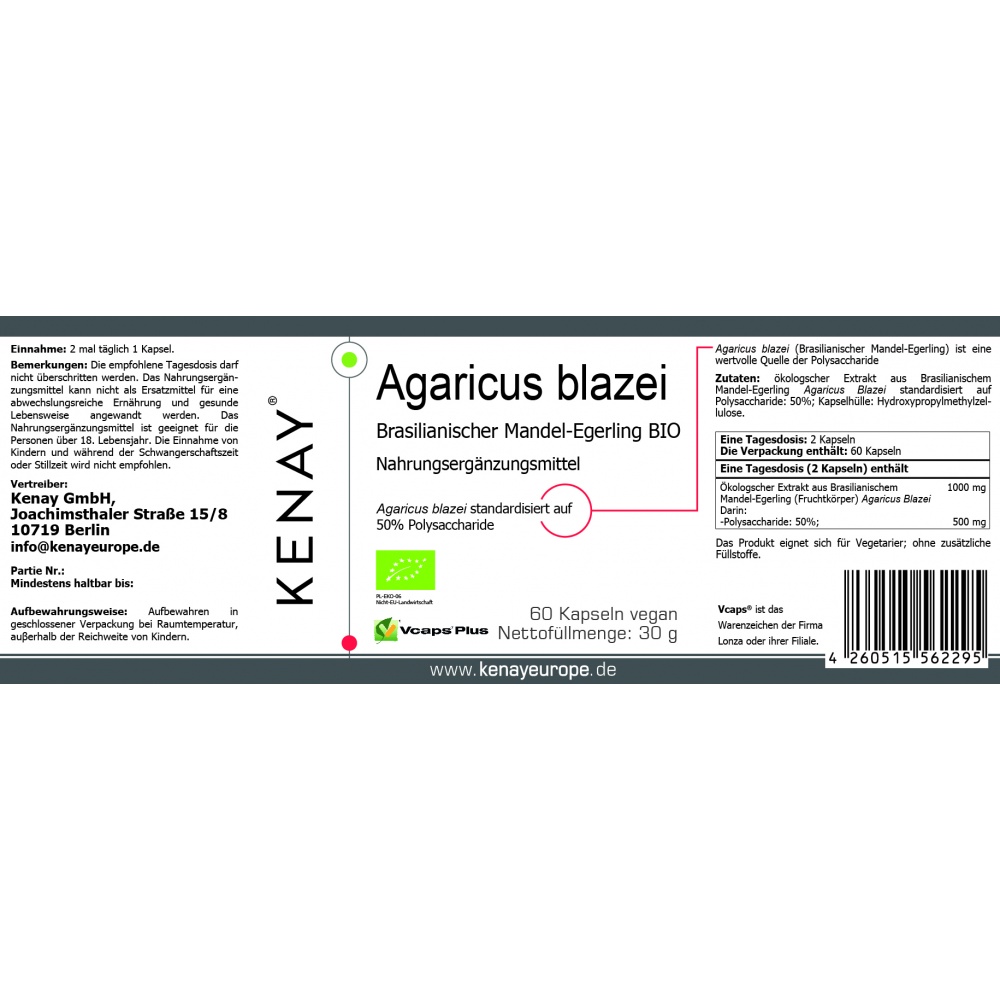Ingredients: Organic extract from the Brazilian mushroom (fruiting bodies) Agaricus blazei, standardized to polysaccharides: 50%; Capsule shell: hydroxypropyl methylcellulose.