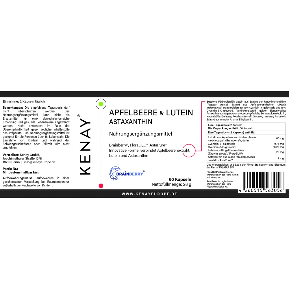 Ingredients: Safflower oil; lutein from marigold flower extract (Tagetes erecta); aronia fruit extract (Aronia melanocarpa) standardized to 15% cyanidin‑3‑galactoside and 15% cyanidin‑3‑O‑glycosides; thickener: yellow beeswax; astaxanthin from Haematococcus pluvialis microalgae; sunflower lecithin; capsule shell ingredients: gelatin, humectant: glycerol, water, color: annatto extract, flavoring: ethyl vanillin.